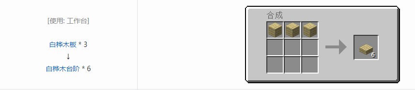 我的世界游戏里面的白桦木台阶合成方法:需要材料3个白桦木板可以获得6个白桦木台阶,可使用3个对应方块合成获得或使用1个对应方块在切石机切石获得。