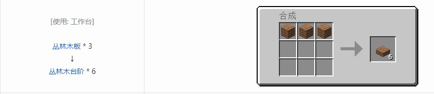 我的世界游戏里面的丛林木台阶合成方法:需要材料3个丛林木板可以获得6个丛林木台阶,可使用3个对应方块合成获得或使用1个对应方块在切石机切石获得。