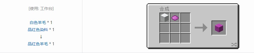 我的世界品红色羊毛制作方法:1个白色羊毛+1个品红色染料可以获得1个品红色羊毛,羊毛也可用于合成旗帜、床、地毯、画,羊毛可作为燃料,每个羊毛可以烧炼0.5个物品,羊毛可以阻断幽匿感测体的感应振动。