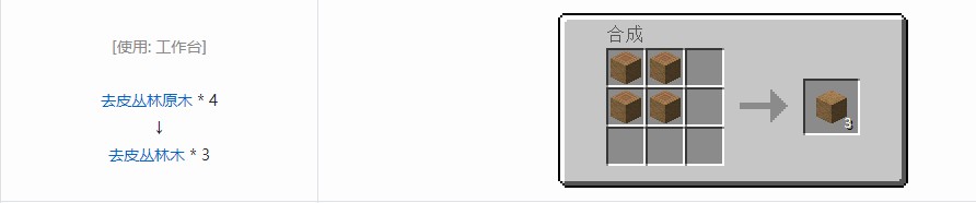 我的世界去皮丛林木制作方法:4个去皮丛林原木可以获得3个去皮丛林木,可使用4个对应去皮原木合成获得,每次合成时获得3个,可用于在合成中替代原木,也可用于当做燃料使用。