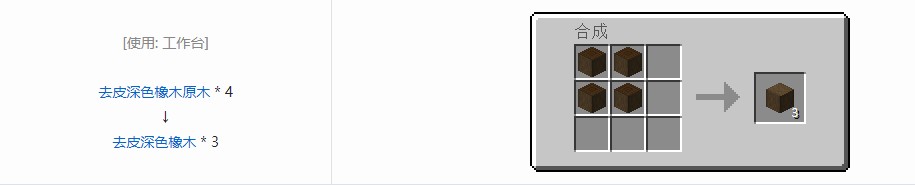 我的世界去皮深色橡木获得方法:通过制作获得,4个去皮深色橡木原木可以获得3个去皮深色橡木,可使用4个对应去皮原木合成获得,每次合成时获得3个,可用于在合成中替代原木,也可用于当做燃料使用。
