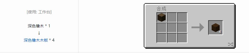 我的世界游戏里面的深色橡木木板合成方法:1个深色橡木可以获得4个深色橡木木板,木板可使用对应原木/去皮原木/木头/去皮木头合成获得,每次合成时获得4个。