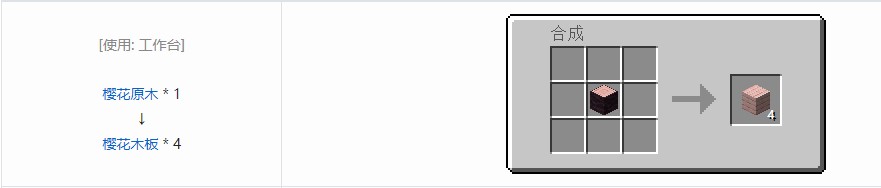 我的世界游戏里面的樱花木板制作方法:1个樱花原木可以获得4个樱花木板,木板可使用对应原木/去皮原木/木头/去皮木头合成获得,每次合成时获得4个。