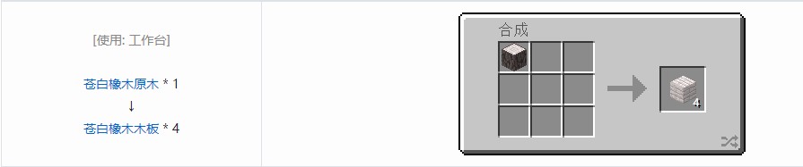 我的世界游戏里面的苍白橡木木板获得方法:通过合成来获得,需要材料1个苍白橡木原木可以获得4个苍白橡木木板,木板可使用对应原木/去皮原木/木头/去皮木头合成获得,每次合成时获得4个。