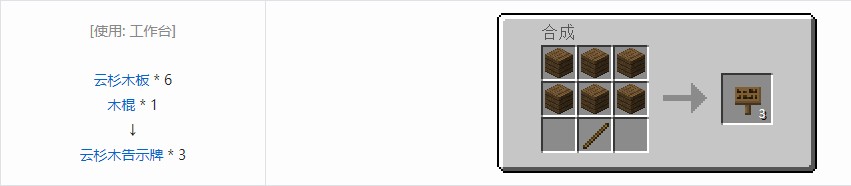我的世界游戏里面的云杉木告示牌制作方法:6个云杉木板+1个木棍可以获得3个云杉木告示牌,可使用6个对应木板和1个木棍合成获得,每次合成时获得3个。