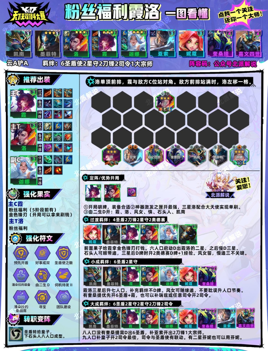 与其他高坚果+豌豆射手阵容不同,是洛在6圣盾的情况下,即使霞被伤害偷死,洛依靠大天使叠到后期的法强加成回血和法强加成的aoe,也能完成残局收割。