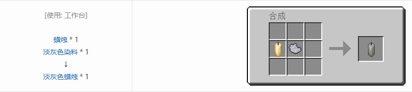 我的世界游戏里面的淡灰色蜡烛制作方法:需要材料1个蜡烛+1个淡灰色染料可以获得1个淡灰色蜡烛,可使用1根蜡烛和1个对应染料合成获得,每次合成时获得1个。
