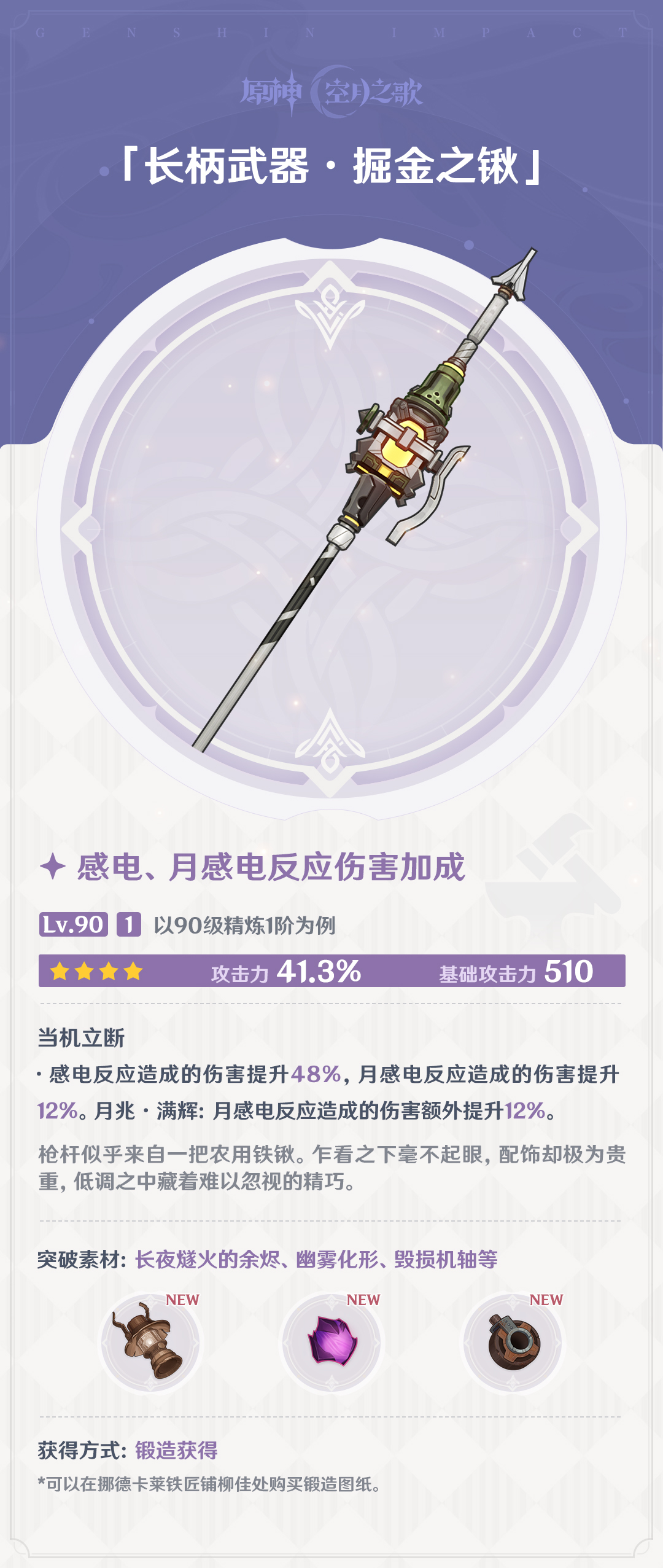 就在最近原神进就要上线月之一版本了,在本次版本更新了许多新内容,有新剧情,新角色,新圣遗物,新的任务,还有新的武器,那么下面就来告诉大家月之一版本新四星武器掘金之锹属性效果一览。