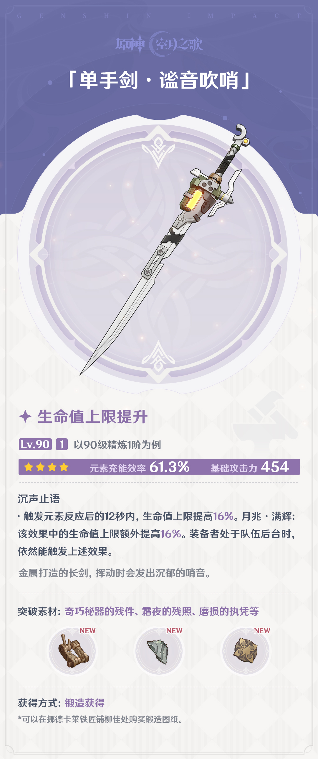 就在最近原神进就要上线月之一版本了,在本次版本更新了许多新内容,有新剧情,新角色,新圣遗物,新的任务,还有新的武器,那么下面就来告诉大家月之一版本新四星武器谧音吹哨属性效果一览。