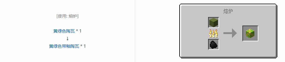 我的世界黄绿色带釉陶瓦制作方法:1个黄绿色陶瓦可以获得1个黄绿色带釉陶瓦,可用于装饰,带釉陶瓦的硬度比石头低,爆炸抗性比原木低,带釉陶瓦是唯一一种活塞可推动但不可拉动的方块。