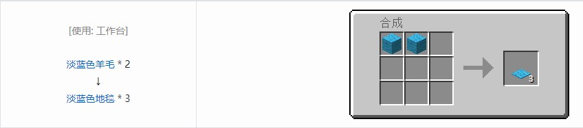 我的世界游戏里面的淡蓝色地毯制作方法:2个淡蓝色羊毛可以获得3个白色地毯,地毯可以放在栅栏或墙的上方,使玩家能够在上面跳跃,地毯可以作为装饰装备在羊驼的身上。