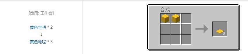 我的世界游戏里面的黄色地毯合成方法:2个黄色羊毛可以获得3个黄色地毯,地毯可以放在栅栏或墙的上方,使玩家能够在上面跳跃,地毯可以作为装饰装备在羊驼的身上。