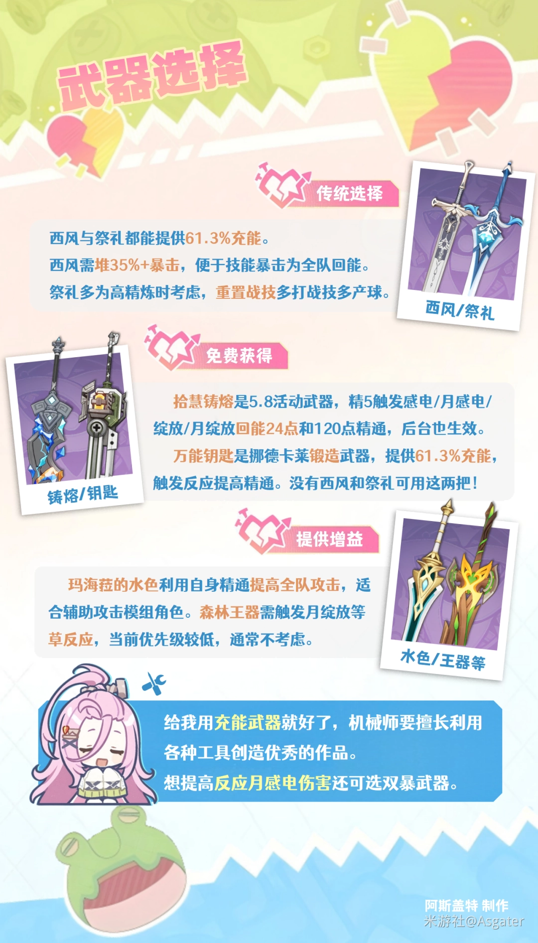 ② 充能武器优选西风大剑、祭礼大剑,前者推荐堆35%+暴击(可选暴击头)、后者推荐高精炼。