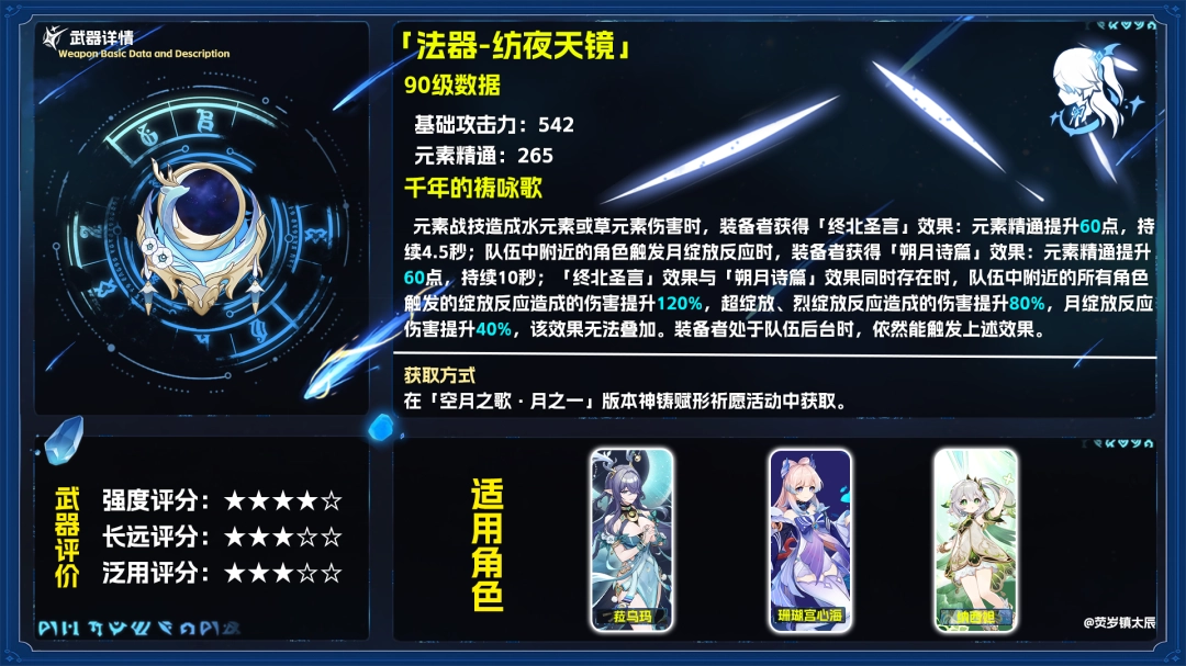 而对于菈乌玛来说,纺夜天镜完美适配她的设计,在满足她高元素精通收益的基础上,还能为队伍提供传统绽放或者月绽放增伤。