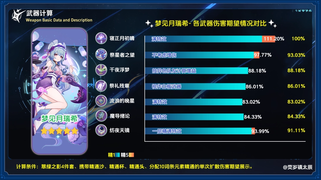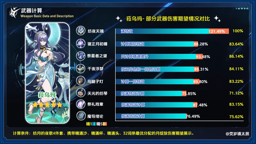 菈乌玛与水草元素存在隐性的高度关联,我们无法忽视这些优秀的水草角色,去谈论纺夜天镜的就业环境,因而这把法器的最终走向,还是要落到菈乌玛身上。