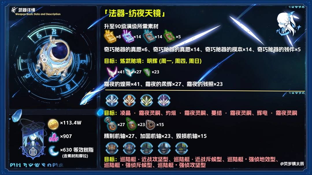 纺夜天镜作为月之一版本的第一把五星武器,走的是精通收益路线,基础攻击力为542,副属性提供265点元素精通,与精通向的千夜浮梦,寝正月初晴、祭星者之望,以及双暴向的万世流涌大典、冲浪时光属于同模法器。