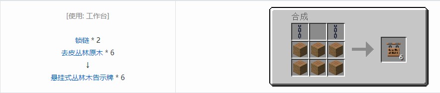我的世界悬挂式丛林木告示牌制作方法:2个锁链+6个去皮丛林原木可以获得6个悬挂式丛林木告示牌,挂在方块底部时,悬挂式告示牌整体没有碰撞箱;挂在方块侧面时,牌面本身没有碰撞箱,顶部的悬挂吊杆有碰撞箱。
