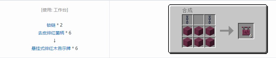 我的世界悬挂式绯红木告示牌制作方法:2个锁链+6个去皮绯红菌柄可以获得6个悬挂式绯红木告示牌,挂在方块底部时,悬挂式告示牌整体没有碰撞箱;挂在方块侧面时,牌面本身没有碰撞箱,顶部的悬挂吊杆有碰撞箱。