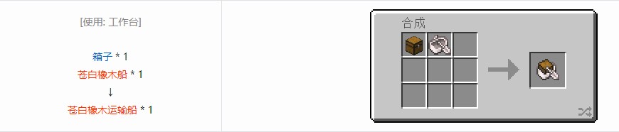我的世界游戏里面的苍白橡木运输船制作方法:需要材料1个箱子+1个苍白橡木船可以获得1个苍白橡木运输船,只能乘载一个实体,存储空间是27格,在成年猪灵附近打开或者破坏运输船会使其与玩家敌对。