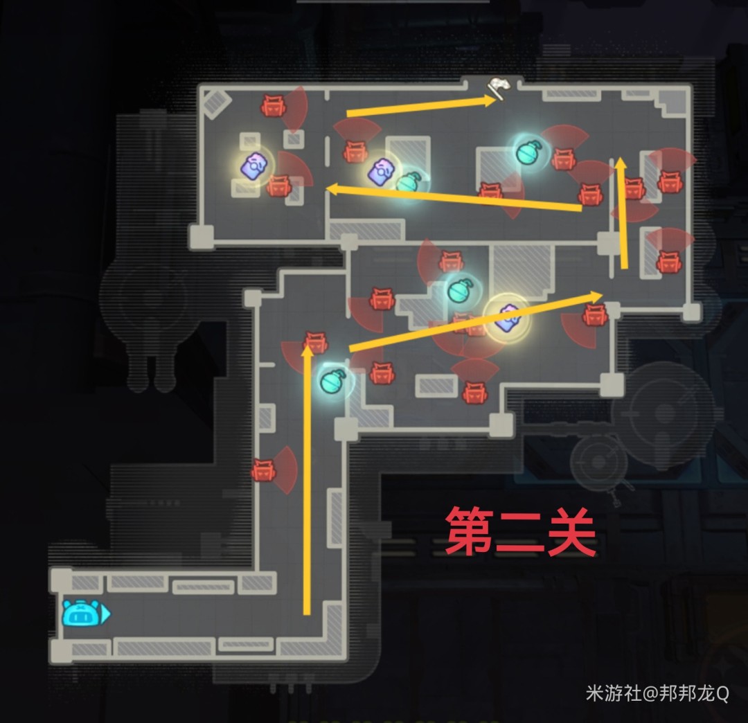 一定要记得走蓝色的格子,可以让我们加速。同时场地有月矩力炸弹,我们交互拾取可以用来破坏掉巡逻器械以及识别卡!