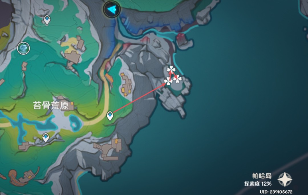 ●位于「苔骨荒原」右边的传送锚点,沿路线可采集6个「霜盏花」;
