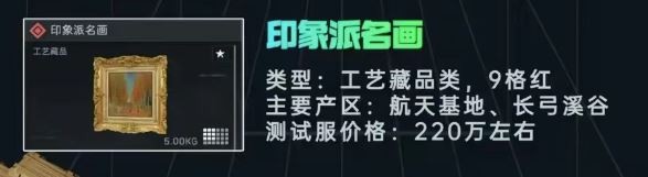 印象派名画:工艺藏品9格红,稀有收藏品,可兑换限定皮肤,主要产出在航天基地和长弓溪谷。