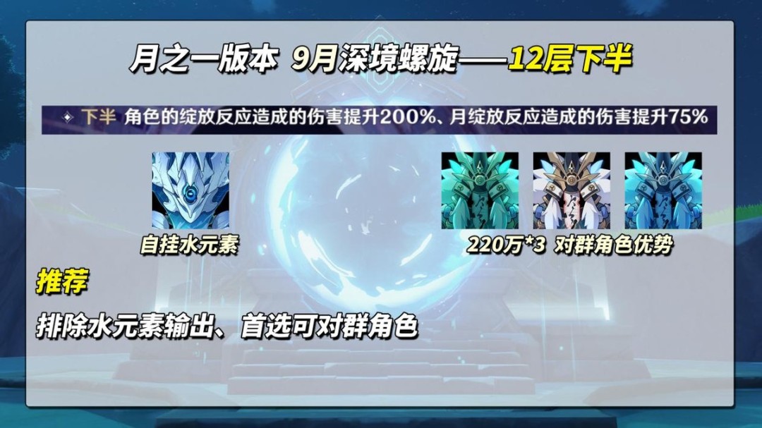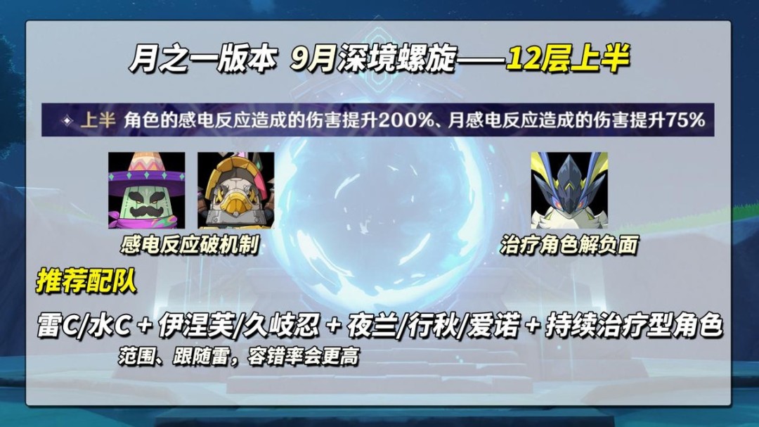 至于环境给的“角色的感电反应造成的伤害提升200%、月感电反应造成的伤害提升75%”不必太过纠结,敌方弱点并不强求月感电队伍,普通感电反应也能破除。