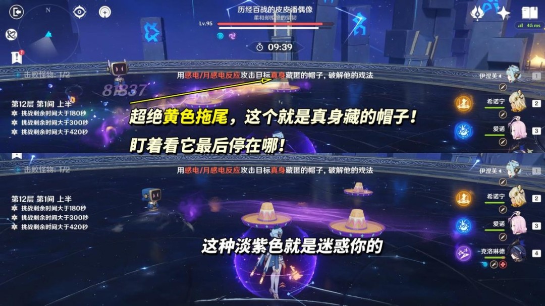 进入战斗时「皮皮潘偶像」会立即原地蓄力,在场地幻化出3个帽子,此时不要急,看看哪个帽子移动的时候带有黄色拖尾,那个就是本体帽子,10多秒后帽子会开始重新位移,可用感电反应将其定在原地挨打。