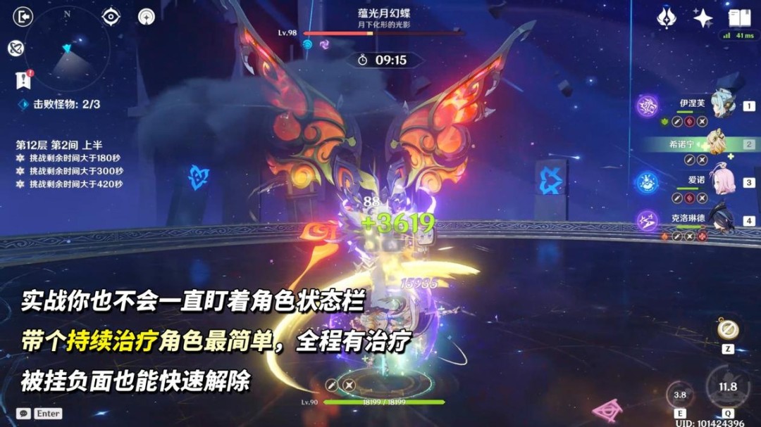 组队建议满足这3个条件“主C为水或雷、存在水雷可感电、带治疗辅助”,感电用于破除第1间「皮皮潘偶像」与第3间「重拳出击鸭」机制,治疗则是克制第2间「蕴光月幻蝶」降低我方伤害的机制。