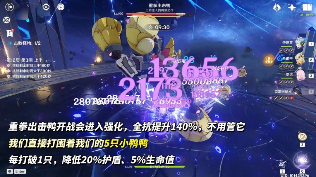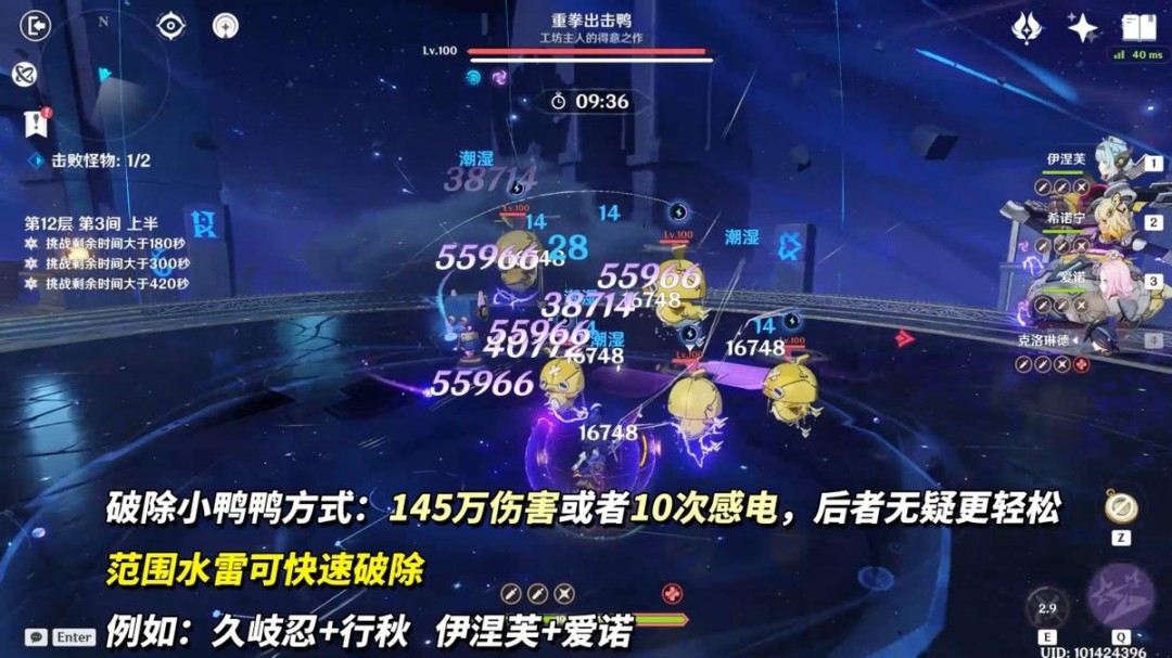 破除小鸭鸭方式有2种,造成145万伤害或者10次感电伤害。由于小鸭鸭除雷元素其他都是150%抗性,用感电破除最简单。例如“久岐忍+行秋”、“伊涅芙+爱诺”小鸭鸭都是扎堆的,直接范围水雷。