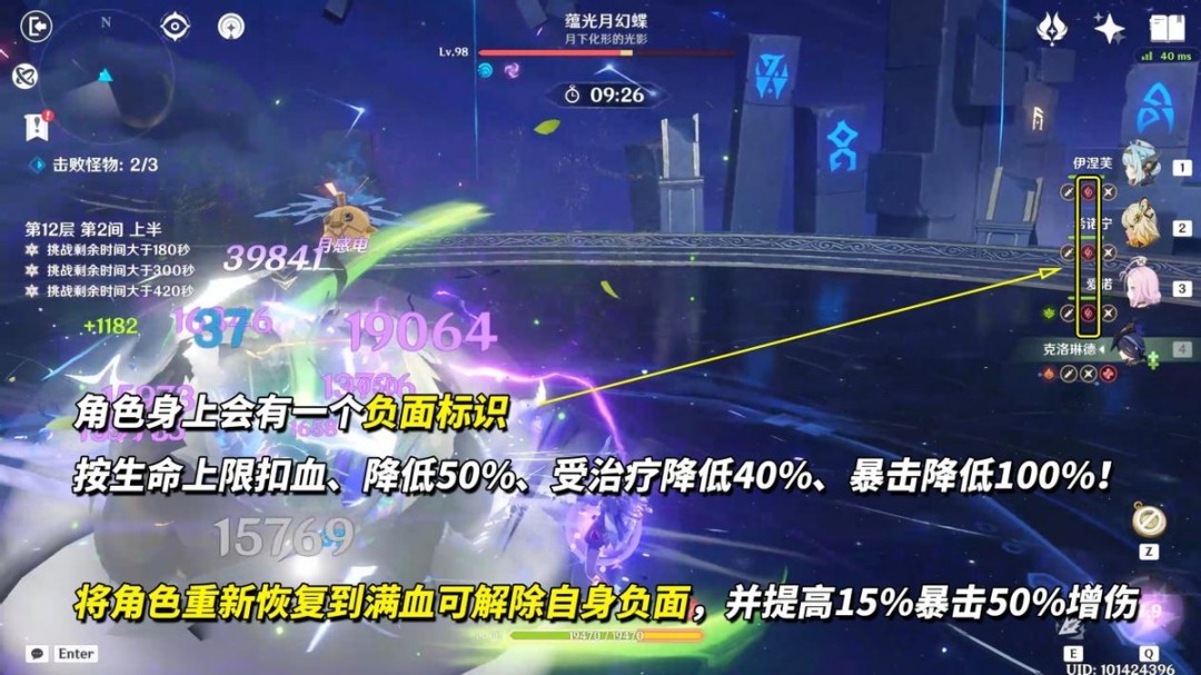 让角色生命值回满可解除自身负面效果,并获得15%暴击50%增伤的补偿。若你不想一直盯着血条状态栏,直接带持续型治疗辅助最方便,重点解除输出角色的负面状态。