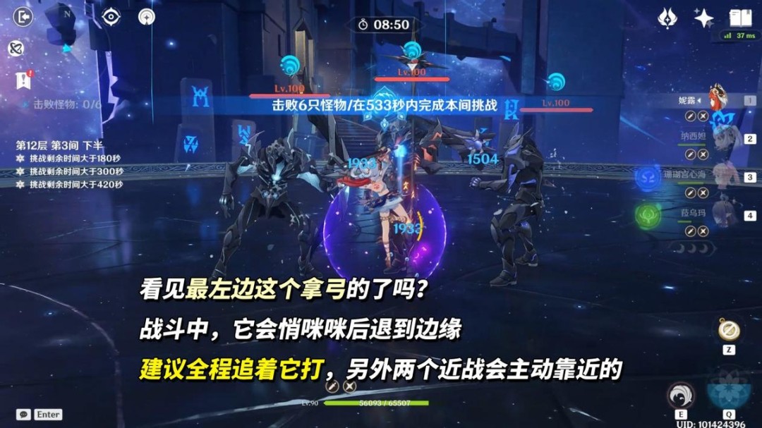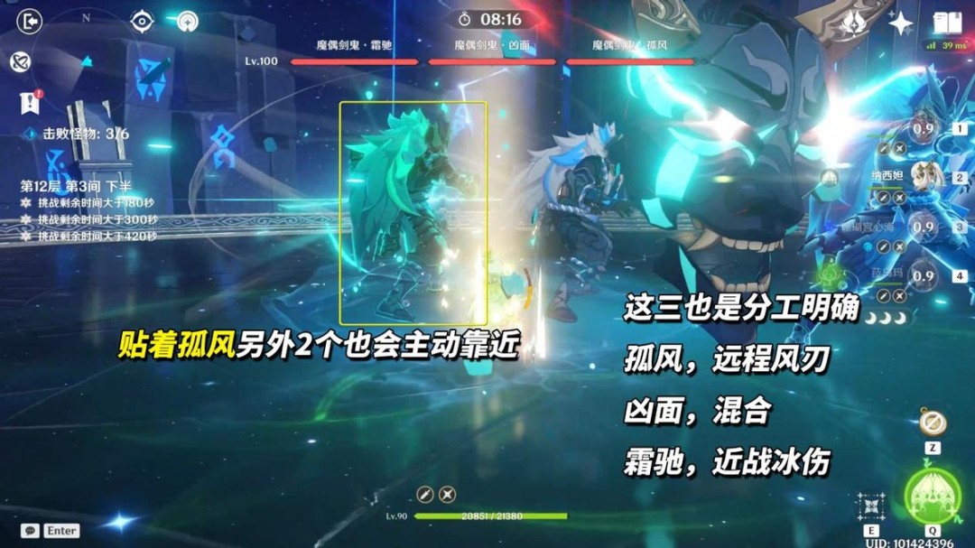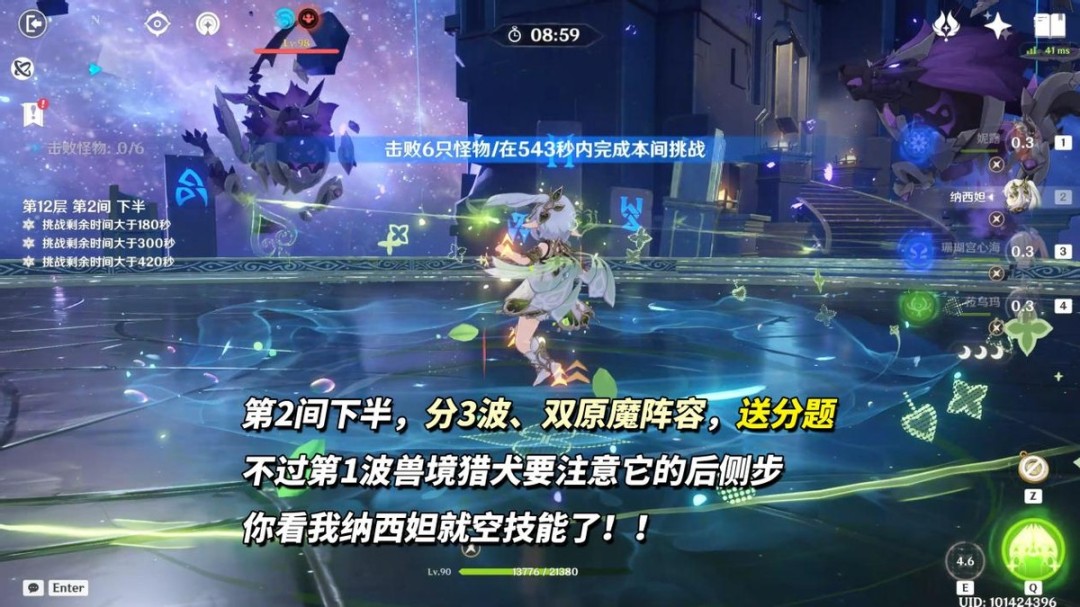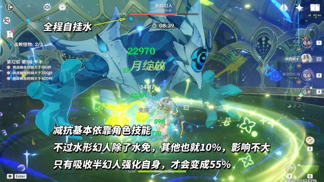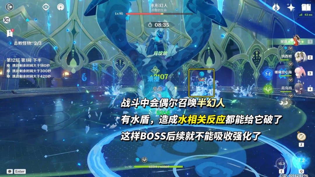 第1间「水形幻人」是在第2波登场,第1波是两个扎堆站的浊水喷吐幻灵,60多万血不会拖太多时间。当「水形幻人」登场后,多注意场地情况,出现召唤物半幻人时,用可与水反应的元素把它破了,避免BOSS被强化。