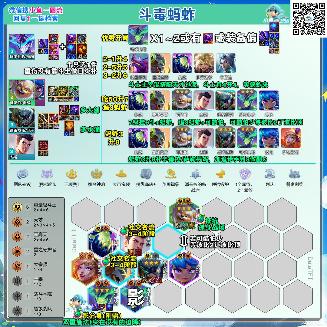 果实:玛尔扎哈(刚需影分身,全阶段可出,4到5阶段概率提升1.17倍,实在没有就只能拿双重施法将就)杰斯/剑魔(优选社交名流,3到4阶段可出,其中杰斯11.1%剑魔14.6%,理论杰斯好吃两倍名流加成,实际剑魔便宜概率高)3星可酷伯(次选孤身战场/抵抗)波比(次选孤身战场/身体变换)