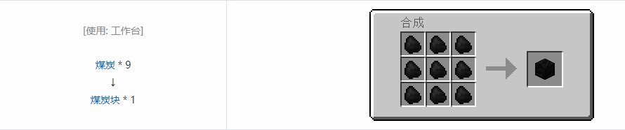 用途:可用作熔炉的燃料使用,1 个煤炭块可烧炼 800 秒(80 个物品),是 1 个煤炭的 10 倍。