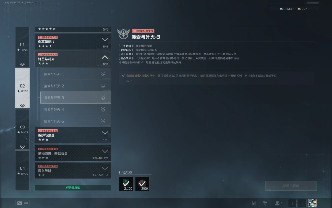 1、任务目标:在任意机密/绝密行动中,使用任意突击/侦察类特战干员时,使用任意腰际射击精度≥99的枪械,累计击败2名敌方特战干员