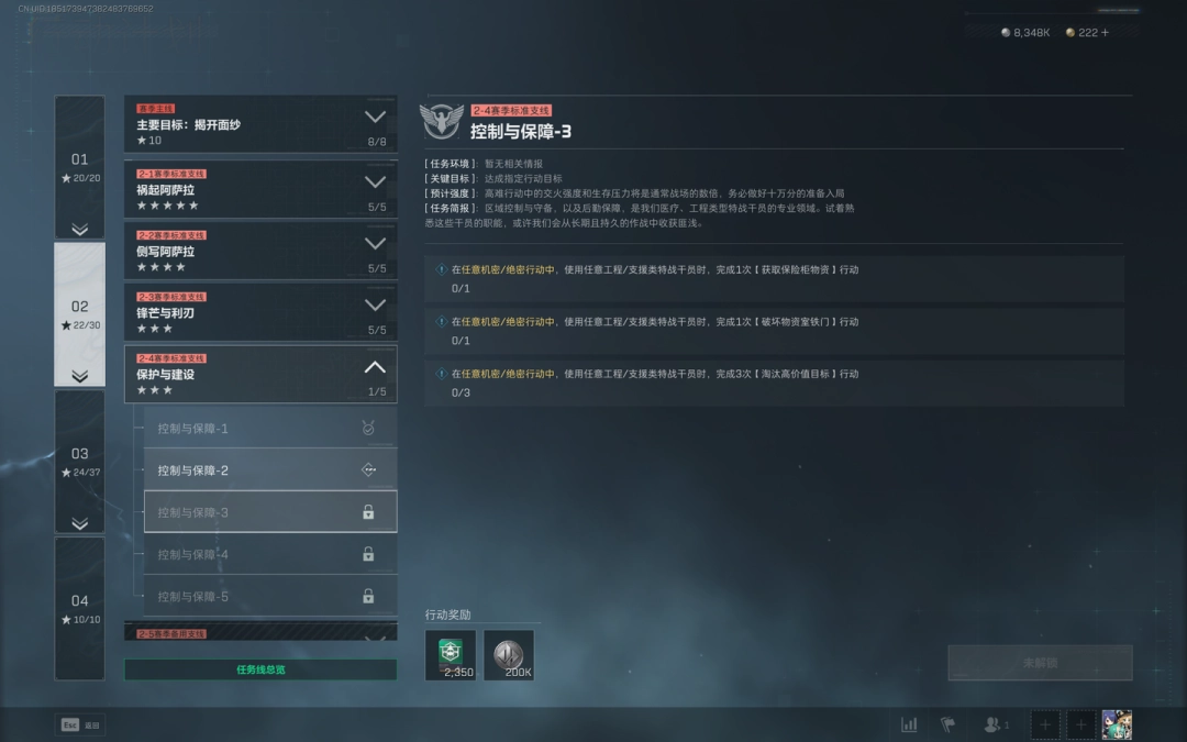 在任意机密/绝密行动中,使用任意工程/支援类特战干员时,完成3次【淘汰高价值目标】行动。