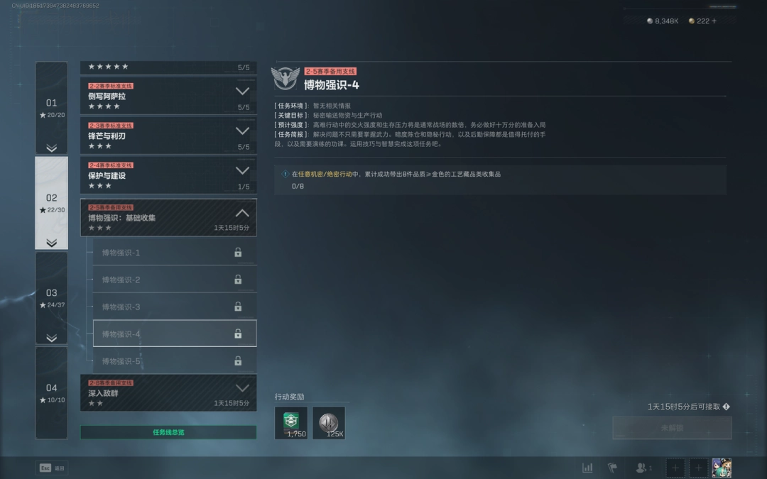 1、任务目标:在任意机密/绝密行动中,累计成功带出8件品质≥金色的工艺藏品类收集品。