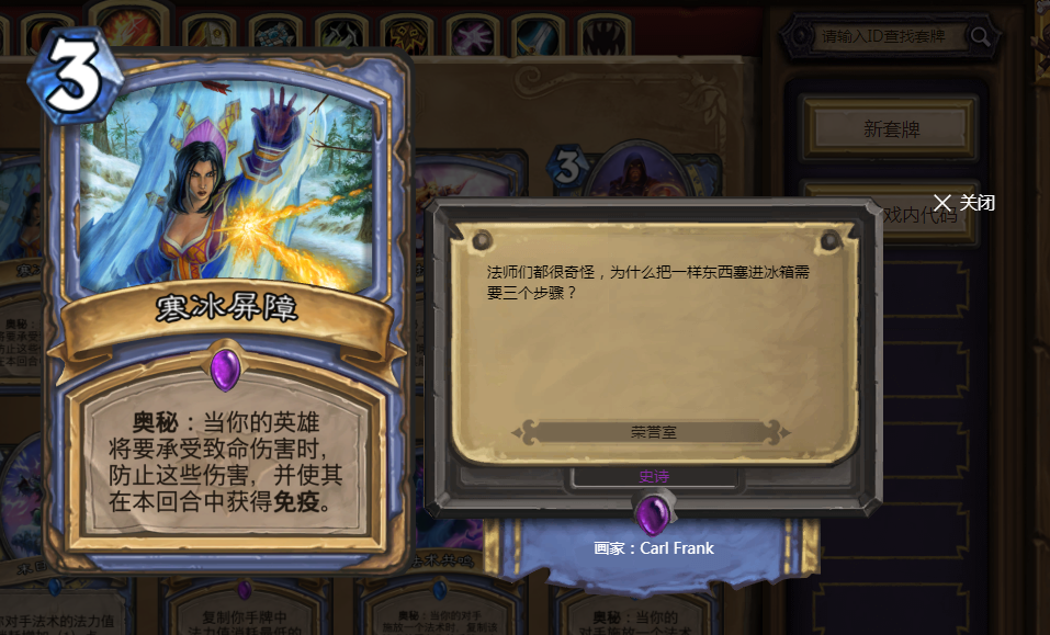 如果提起OTK卡组则不能不提冰法。作为早期最经典的OTK玩法,他的出现可以说让苟发挥到了机制。前期利用各种冰封法术解场控场,当来到10费开始,就来到他熟悉的反击时刻。红龙一喷火强行变成了15血,最后一回合内搭配各种低费法术将对方秒掉。不过随着寒冰屏障的加入荣誉室,这种玩法也已经成为了过去式,只存在大家的回忆之中。