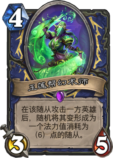玉莲帮跟萨满的切合度还是非常高的,使得青海萨一下子成为当时版本萨满的一哥卡组。不过在萨满职业中,有一张玉莲帮的随从就比较让人看不懂了,那就是玉莲帮幻术师,不知道是不是本小编孤陋寡闻,反正这张卡牌我从来没有看到过在哪个萨满卡组中出现过。玉莲帮幻术师自身3-5的身材略微亏一点模型,特效的话需要进攻敌方英雄才能触发,变形为六费的随从,用来解场的话是无法触发的,并且六费随从中有类似于奥能水母,沟蕖潜伏者,犯罪高手这样逗比身材随从,实在太不稳定,又难触发特效。