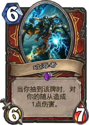 战士有很多让敌人受伤的职业随从,比如暴虐食尸鬼,掷弹机器人都有很高的出场率,但是你见过一张只会对自己方随从造成伤害并且触发概率完全是随机不可控的随从吗?有,就是冠军试炼版本战士的七费随从破海者。虽然破海者的随从名称十分霸气,连海都能破,结果实际上,别说海了,连敌方的火焰图腾都破不了,因为他会“窝里凶”,而且这个随从的特效只会在抽到该牌的时候触发,概率完全是随机。