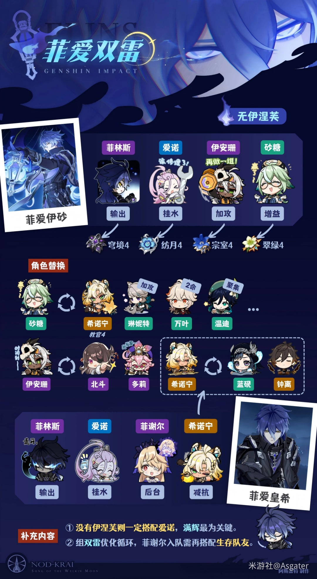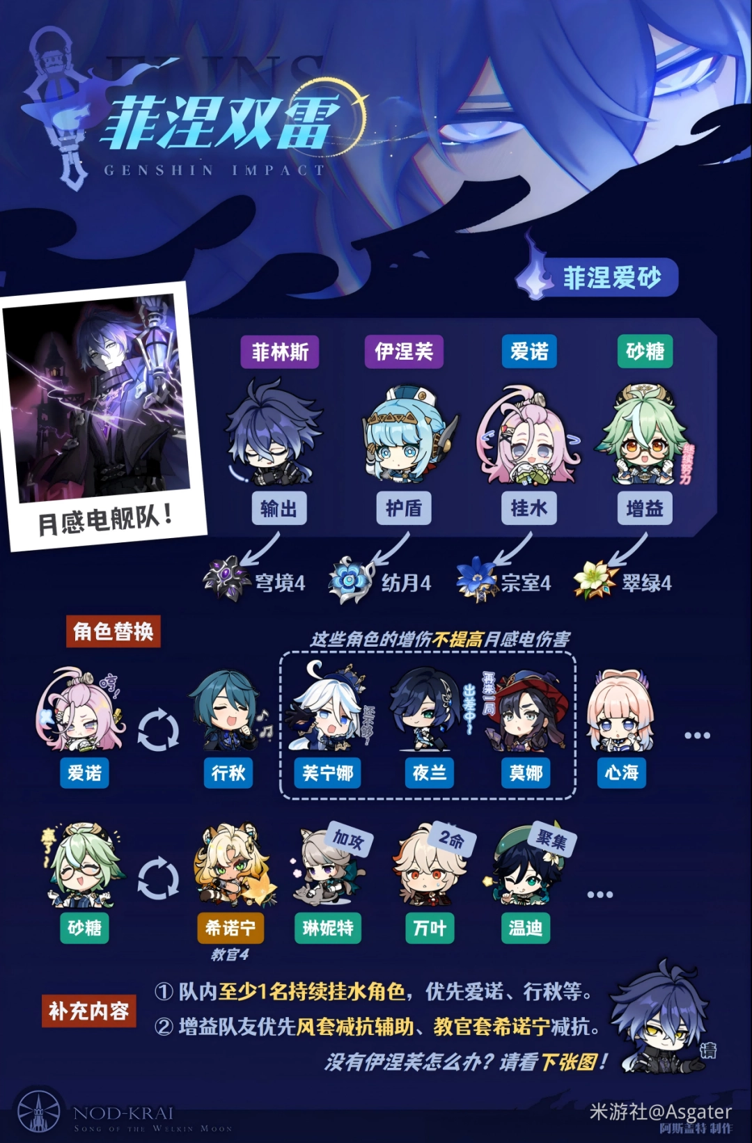 ④ 第四位增益队友优选风套辅助、希诺宁提供减抗——水雷共存时,风、岩元素优先与雷元素触发雷扩散、雷结晶,触发增益简单,所以可先让水、雷后台施放技能,再由砂糖、希诺宁等角色触发扩散、结晶等反应,最后菲林斯登场输出。