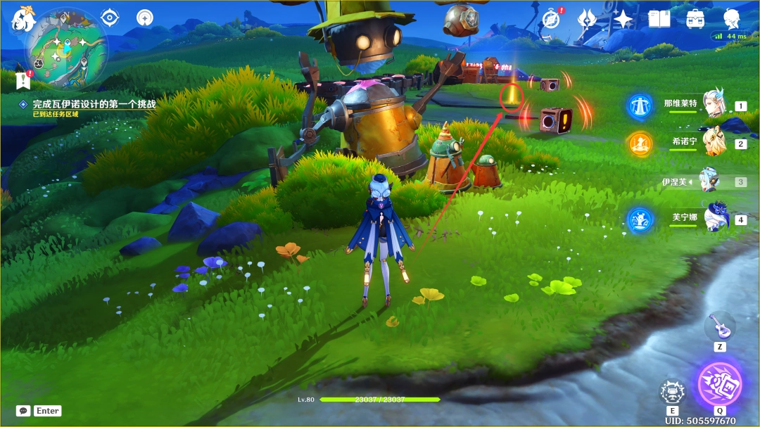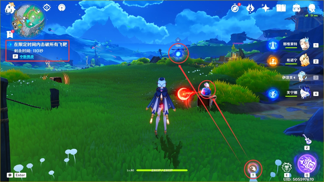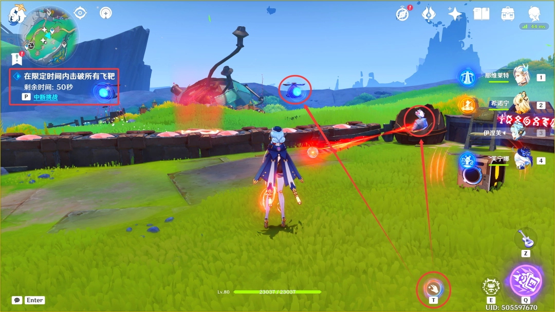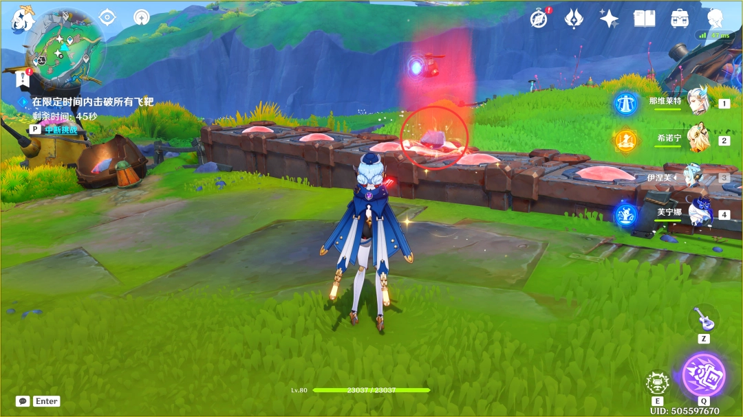开启挑战后,我们利用「月矩力」吸取「双极」石块,需要在120秒内,将出现的所有飞靶击破(这里需要我们沿路击破飞靶,中途需要借助「月灵旅路」快速移动,完成挑战后不会出现宝箱)