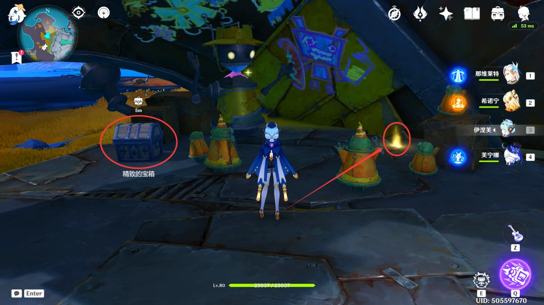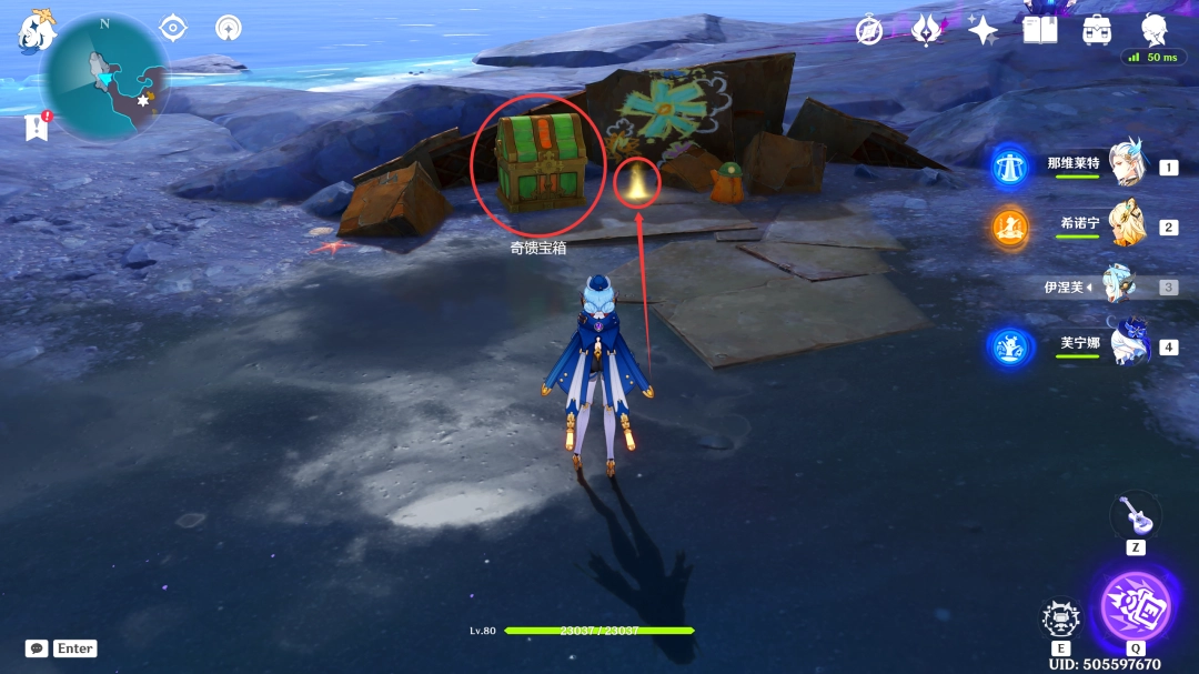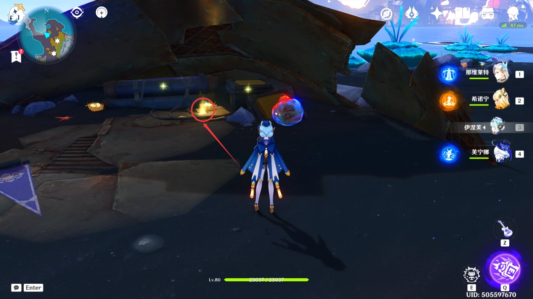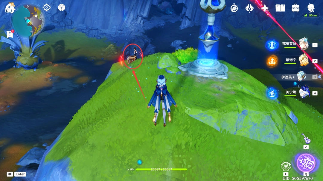 来到此处后,我们与这里的光团交互,获得一个「印有海螺纹样的纸页」(此处有一个奇馈宝箱可以顺手开启)