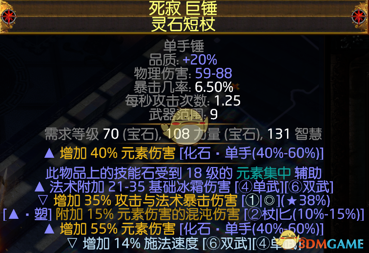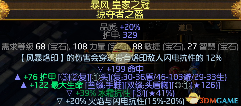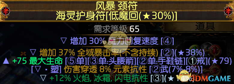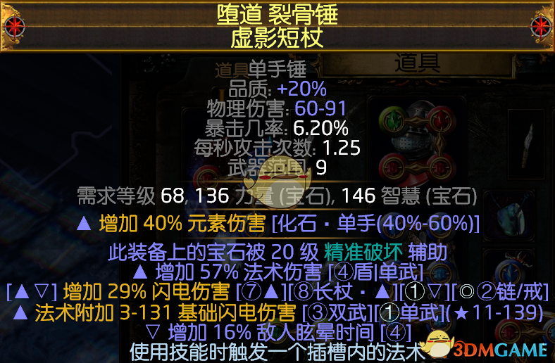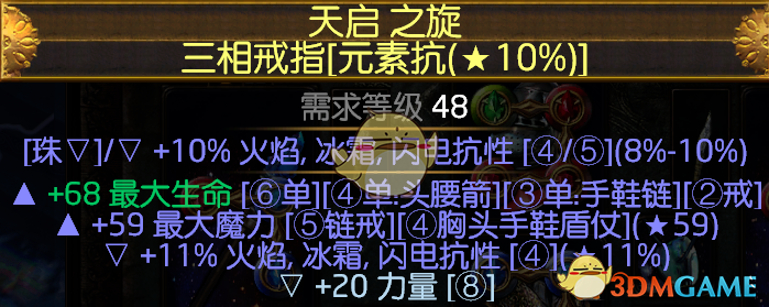 词缀优先顺序:【20%元素伤的混沌伤害】>【T1施法速度】=【T1暴击伤害】>【T1点伤】>【T1元素伤害】>【T1暴击】>【T1闪电伤害】