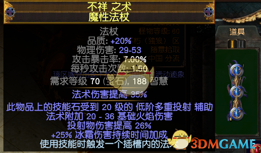 如图所示,用改造洗出一个“冰霜伤害持续时间加成”(其实是国服翻译问题,正确的应该是冰霜持续伤害加成),这是前缀,洗到25%以上,就可以增幅富豪,然后附魔一个“使用技能时触发插槽内的法术”,3c,很便宜。这种法杖可以一直用,要的就是附魔词缀。