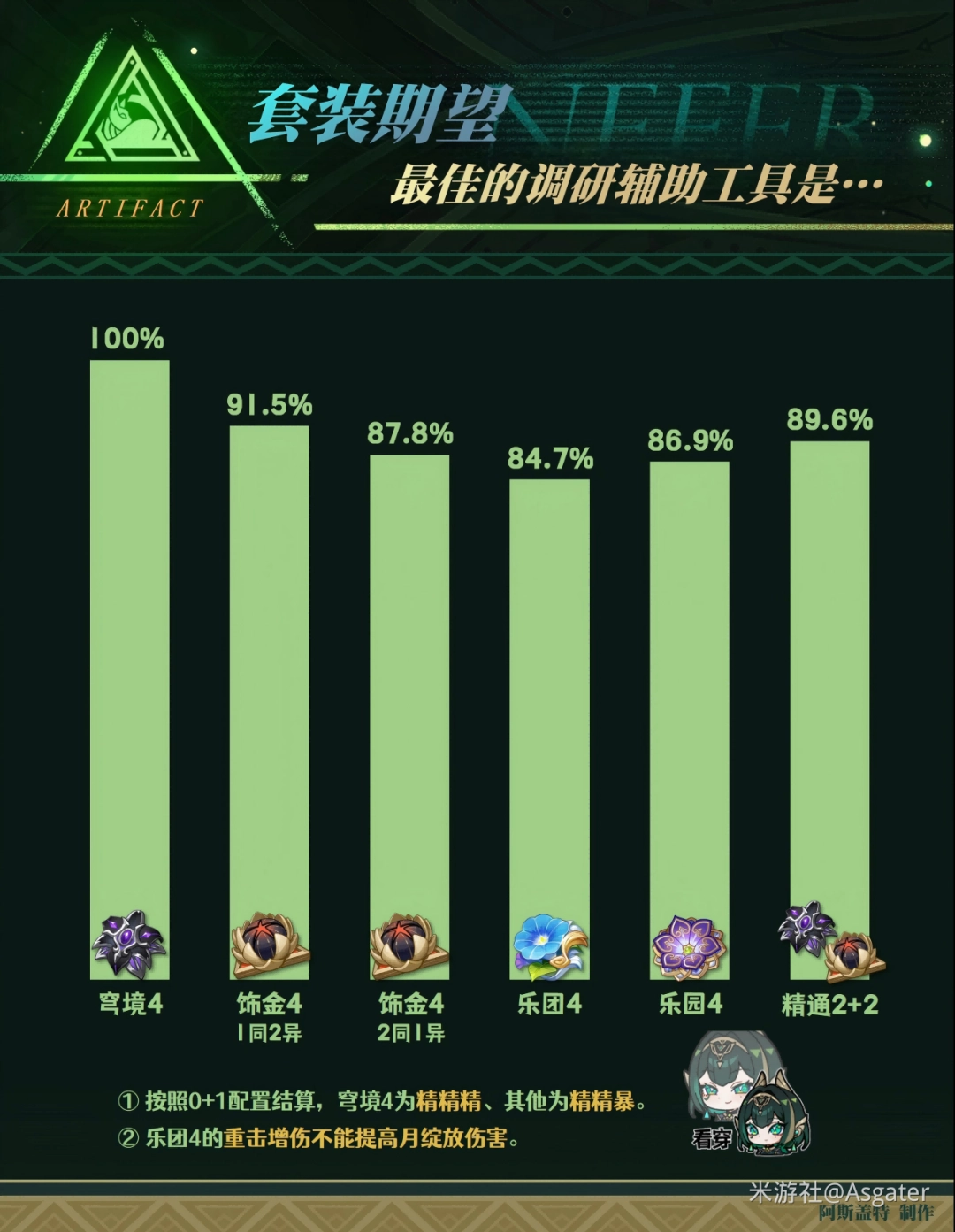①【穹境4】是最契合奈芙尔的套装——降低圣遗物暴击需求、更易满暴。