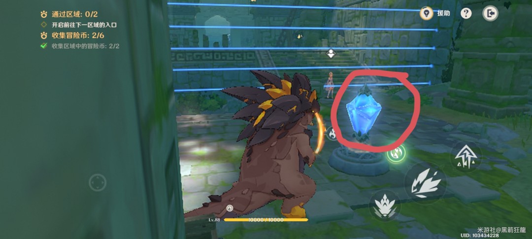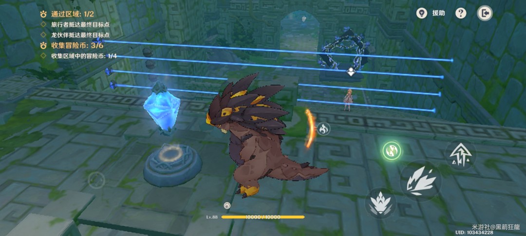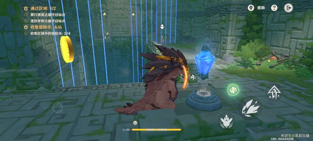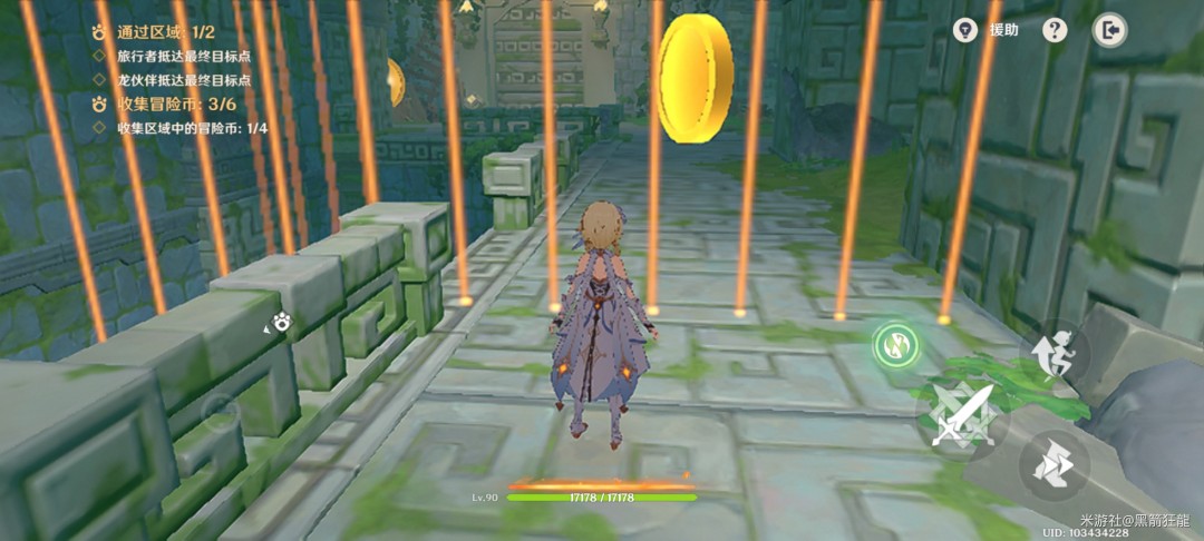 切换旅行者,拿第四个金币,走到蓝色激光前。