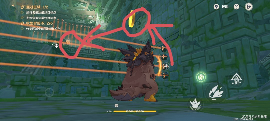 绕过激光后,下来拿第二个金币,攻击橙色按钮。