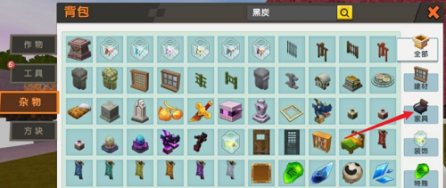 2、点击杂物菜单里面的家具按钮,查看所有家具。