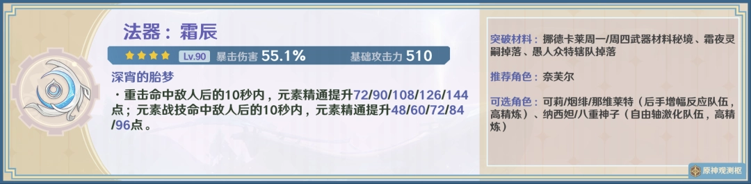 2.3. 纳西妲、八重神子在可以自由施放重击的激化队伍中,高精霜辰在四星武器中较为优先,但有队伍与手法限制。
